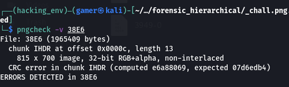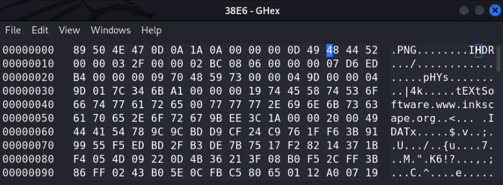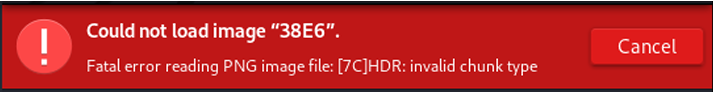 Ketika dilakukan analisis hexdump pada file tersebut, ditemukan bahwa terdapat content file yang tidak sesuai dengan signature file PNG yang biasanya PNG-Gradient hex - PNG - Wikipedia. Pada chunk IHDR file PNG yang muncul mulai pada offset byte ke 13, seharusnya berisi IHDR atau 49 48 44 52 dalam hexadesimal. Namun file ini berisi |HDR, sehingga terdapat error tersebut. Hal ini diperbaiki dengan mengubah content file tersebut menjadi IHDR menggunakan hex editor, dalam hal ini kita gunakan GHex